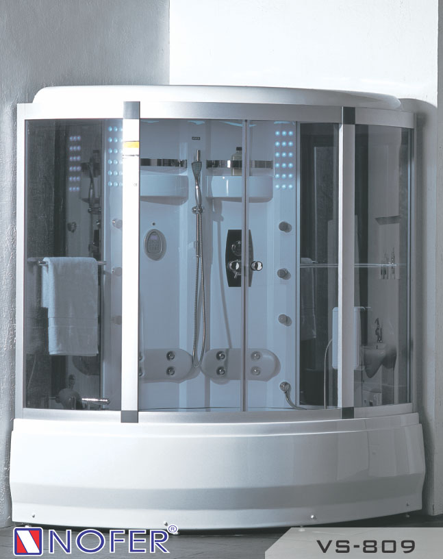 - Ngoài chức năng xông hơi bằng hơi nước, phòng tắm xông ướt hơi Nofer VS 809 còn là một chiếc bồn tắm massage cao cấp khi nó được thiết kế các mắt sục massage dưới phần chân đế cao được làm từ nhựa Acrylic Ngọc Trai